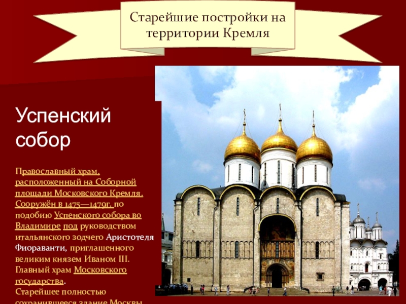 Соборной площади Московского Кремля. Сооружён в 1475—1479г. по подобию Успенского собора во Владимире под руководством итальянского зодчего Аристотеля Фиораванти, приглашенного великим князем Иваном III. Главный храм Московского государства.