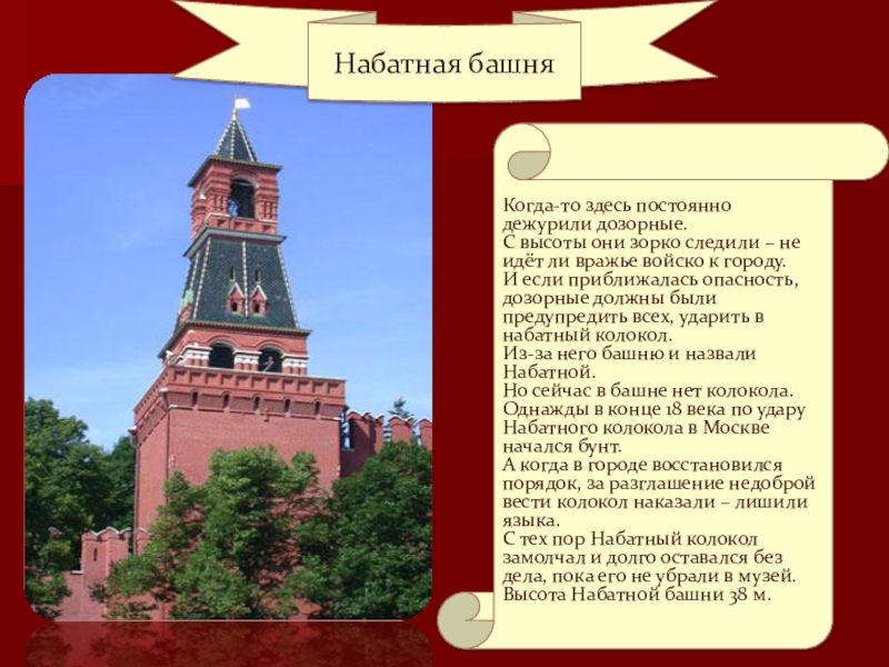 Но сейчас в башне нет колокола. Однажды в конце 18 века по удару Набатного колокола в Москве начался бунт.