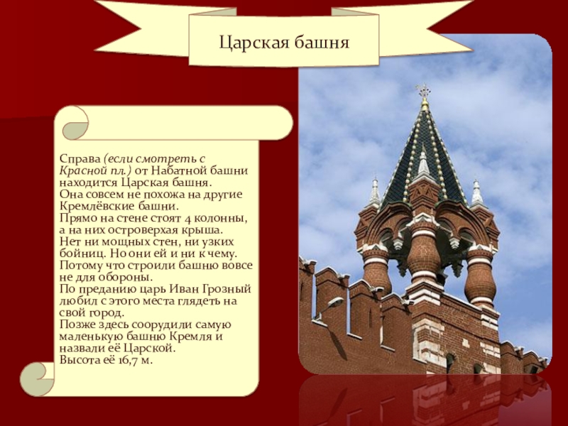 Позже здесь соорудили самую маленькую башню Кремля и назвали её Царской.