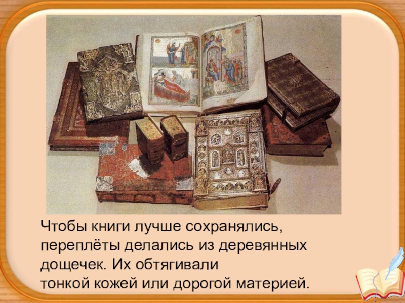 Слайд 17Чтобы книги лучше сохранялись, переплёты делались из деревянных дощечек. Их обтягивали
