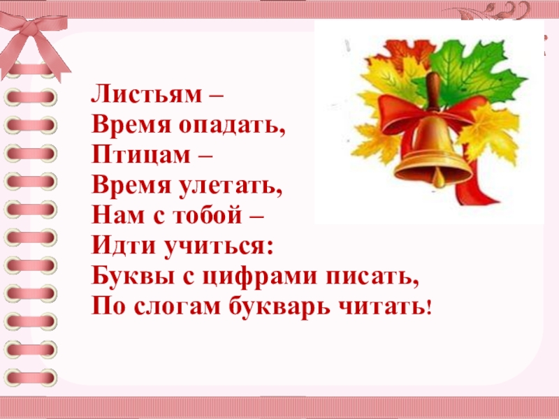 Листьям – Время опадать, Птицам – Время улетать, Нам с тобой –  Идти учиться: Буквы с цифрами писать, По слогам букварь читать!
