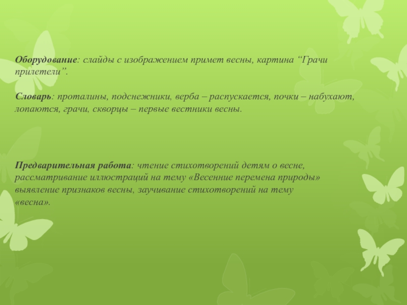 Предварительная работа: чтение стихотворений детям о весне, рассматривание иллюстраций на тему «Весенние перемена природы» выявление признаков весны, заучивание стихотворений на тему «весна».