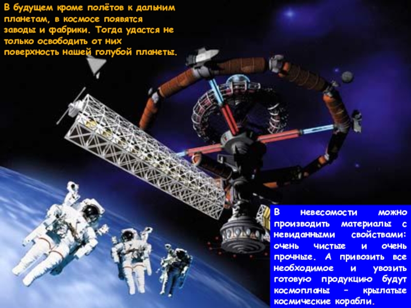 В будущем кроме полётов к дальним планетам, в космосе появятся заводы и фабрики. Тогда удастся не только освободить от них поверхность нашей голубой планеты.