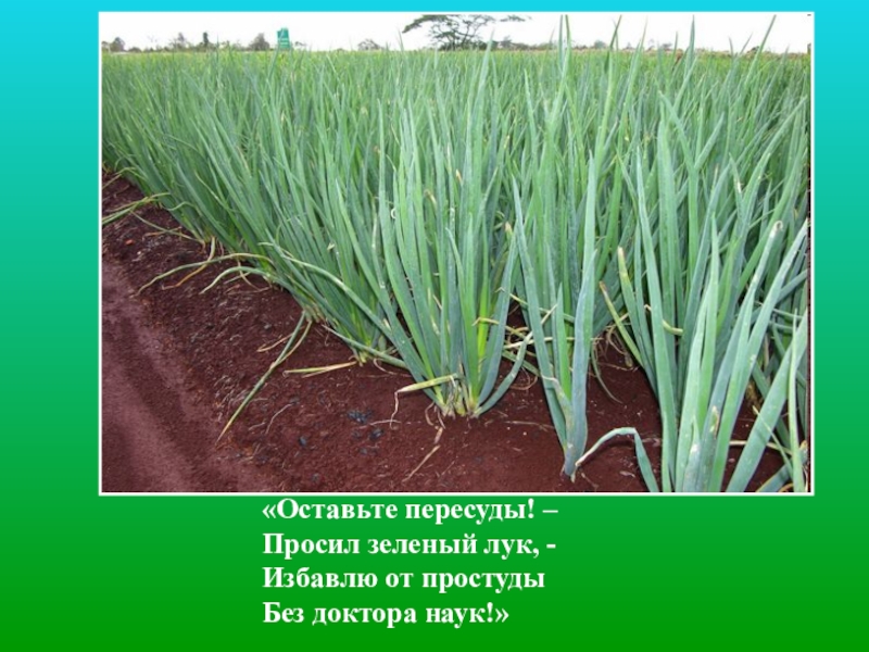 Слайд 11«Оставьте пересуды! – Просил зеленый лук, - Избавлю от простуды Без