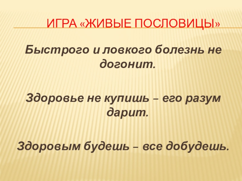 Игра «Живые пословицы»Быстрого и ловкого болезнь не догонит.Здоровье не купишь – его разум
