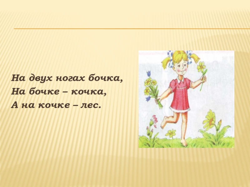 На двух ногах бочка,На бочке – кочка, А на кочке – лес.