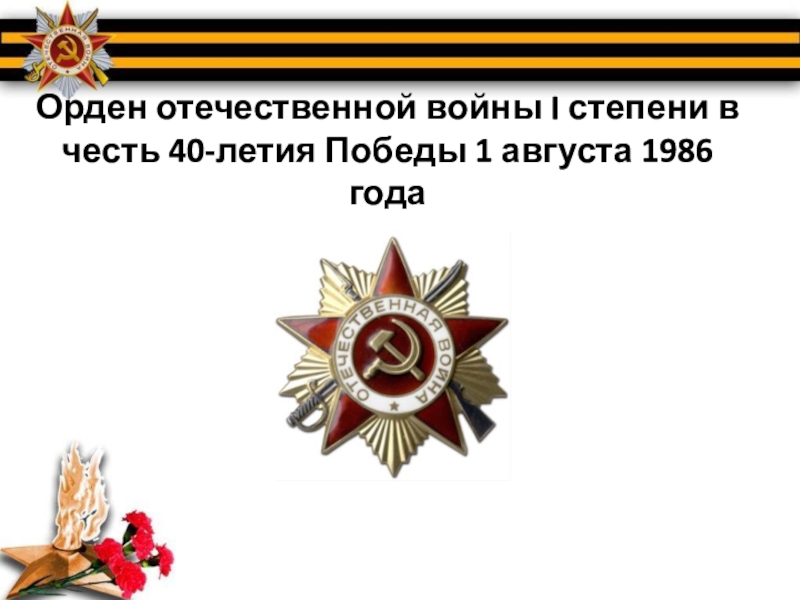 Слайд 12Орден отечественной войны I степени в честь 40-летия Победы 1 августа