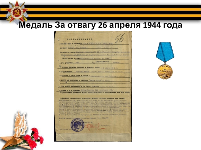 Слайд 8Медаль За отвагу 26 апреля 1944 года