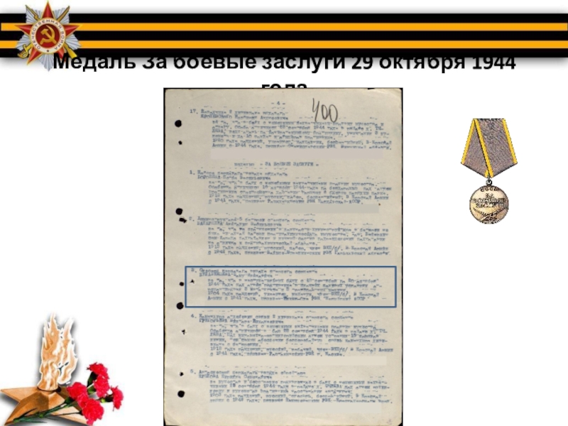 Слайд 4Медаль За боевые заслуги 29 октября 1944 года