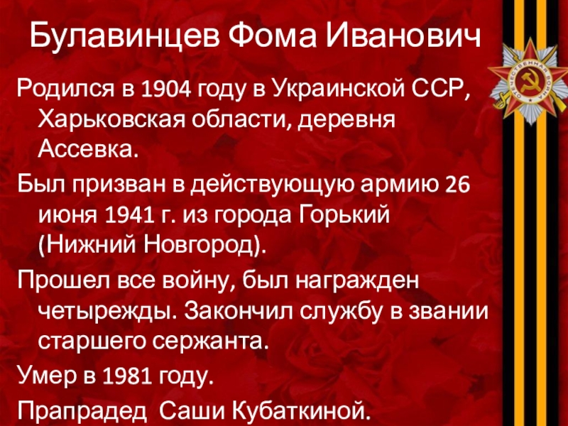 Булавинцев Фома Иванович Родился в 1904 году в Украинской ССР, Харьковская области, деревня Ассевка. Был призван в действующую армию 26 июня 1941 г. из города Горький (Нижний Новгород).Прошел все войну, был награжден четырежды. Закончил службу в