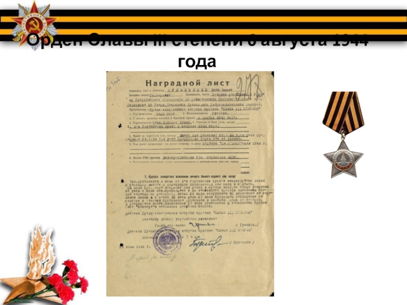 Слайд 9Орден Славы III степени 6 августа 1944 года
