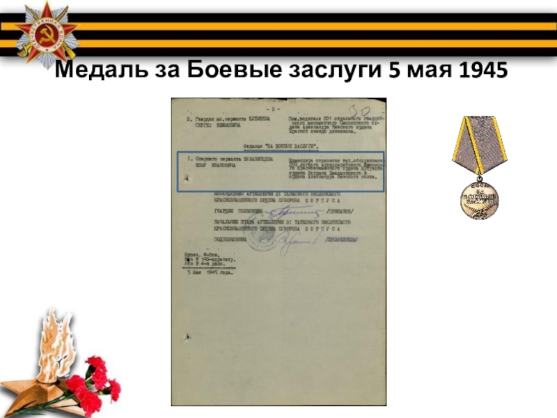 Слайд 5 Медаль за Боевые заслуги 5 мая 1945