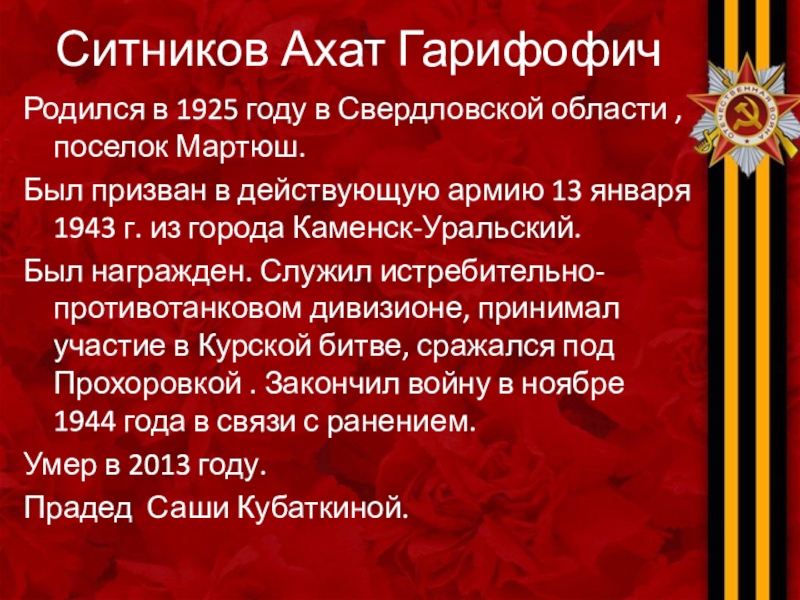 Ситников Ахат ГарифофичРодился в 1925 году в Свердловской области , поселок Мартюш. Был призван в действующую армию