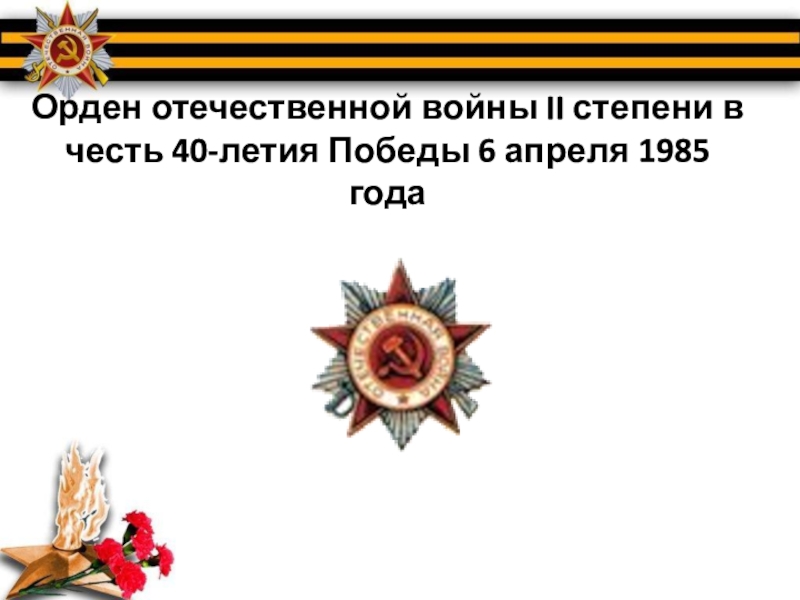 Слайд 16Орден отечественной войны II степени в честь 40-летия Победы 6 апреля