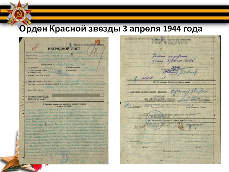 Слайд 15Орден Красной звезды 3 апреля 1944 года