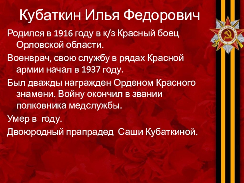 Кубаткин Илья ФедоровичРодился в 1916 году в к/з Красный боец Орловской области. Военврач, свою службу в рядах