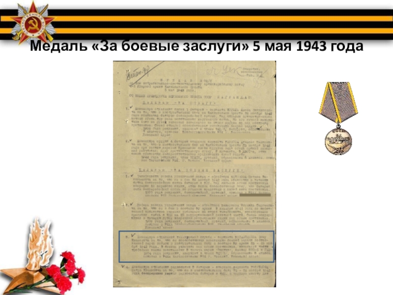 Слайд 3Медаль «За боевые заслуги» 5 мая 1943 года