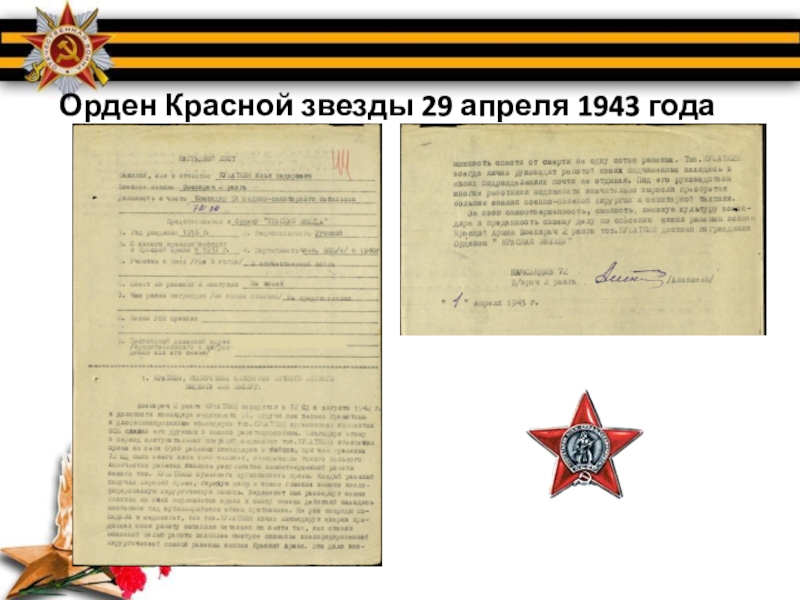 Слайд 14Орден Красной звезды 29 апреля 1943 года