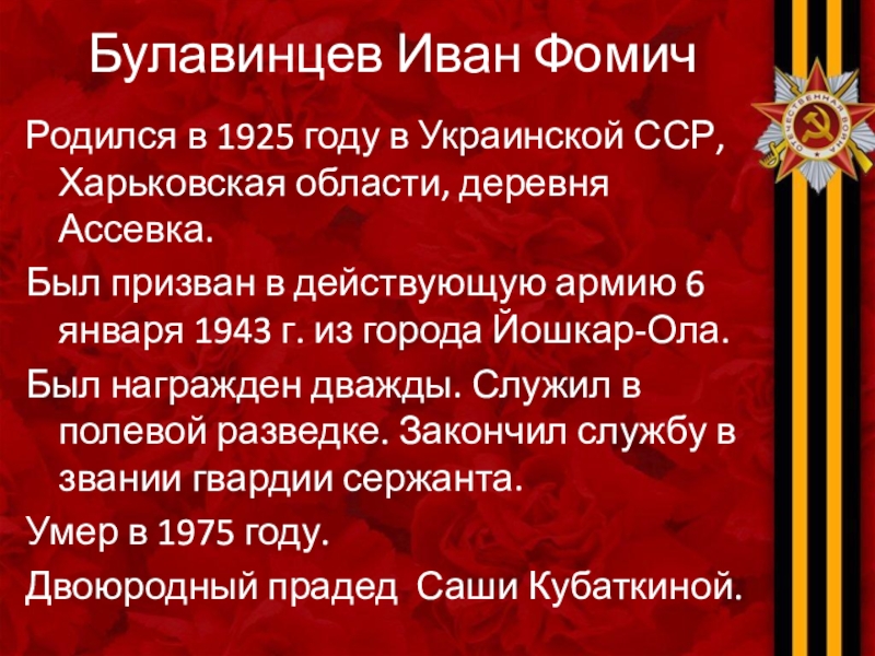 Булавинцев Иван ФомичРодился в 1925 году в Украинской ССР, Харьковская области, деревня Ассевка. Был призван в действующую