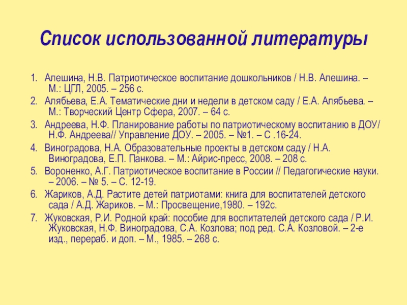 1. Алешина, Н.В. Патриотическое воспитание дошкольников / Н.В. Алешина. –