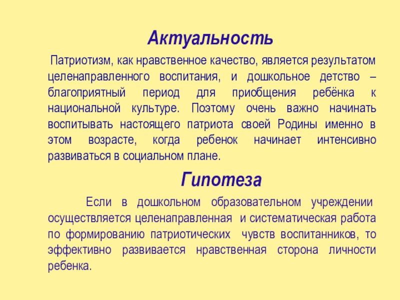 результатом целенаправленного воспитания, и дошкольное детство – благоприятный период для приобщения ребёнка к национальной культуре. Поэтому очень важно начинать воспитывать настоящего патриота своей Родины именно в этом возрасте, когда ребенок начинает интенсивно развиваться в социальном плане.
