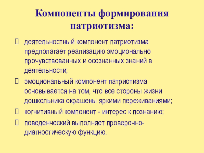 деятельностный компонент патриотизма предполагает реализацию эмоционально прочувствованных и осознанных
