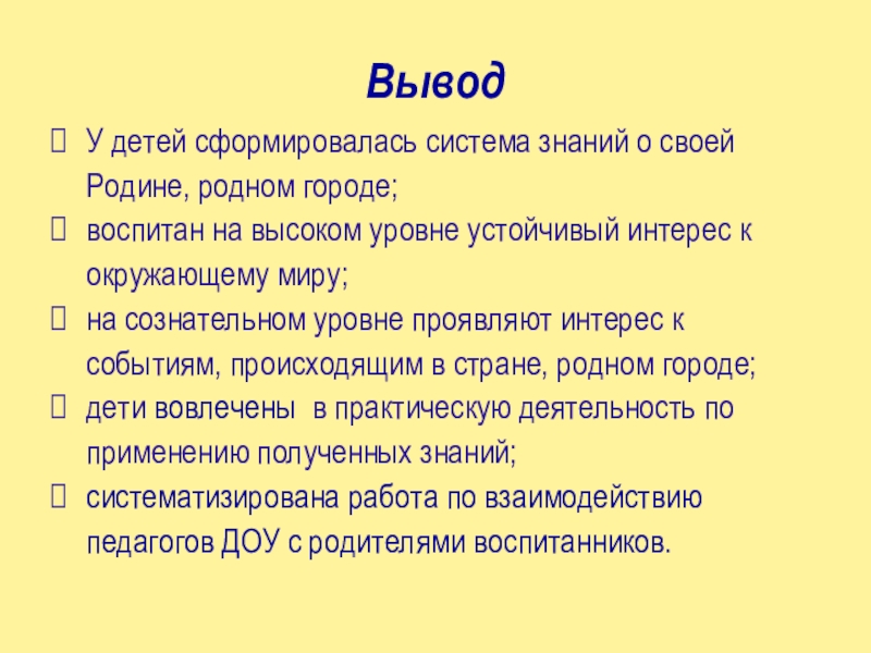 У детей сформировалась система знаний о своей Родине, родном городе;