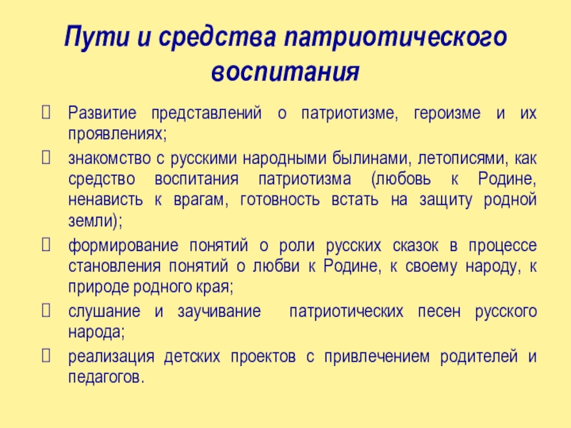 знакомство с русскими народными былинами, летописями, как средство воспитания патриотизма (любовь к Родине, ненависть к врагам, готовность встать на защиту родной земли);