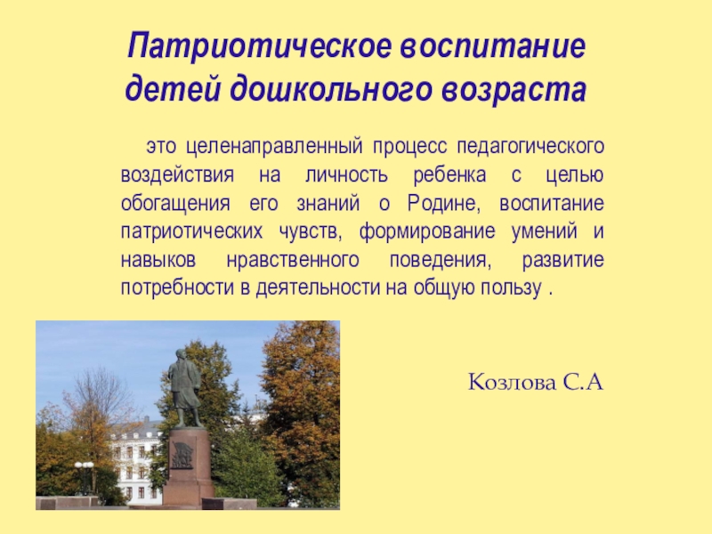 это целенаправленный процесс педагогического воздействия на личность ребенка с целью обогащения его знаний о Родине, воспитание патриотических чувств, формирование умений и навыков нравственного поведения, развитие потребности в деятельности на общую пользу .