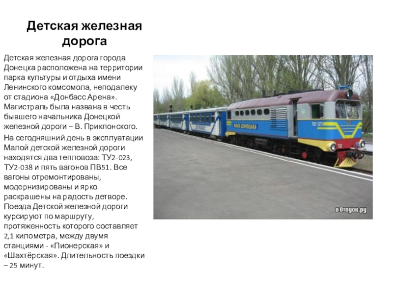 На сегодняшний день в эксплуатации Малой детской железной дороги находятся два тепловоза: ТУ2-023, ТУ2-038 и пять вагонов ПВ51. Все вагоны отремонтированы, модернизированы и ярко раскрашены на радость детворе. Поезда Детской железной дороги курсируют по маршруту, протяженность которого составляет 2,1 километра, между двумя станциями - «Пионерская» и «Шахтёрская». Длительность поездки – 25 минут.