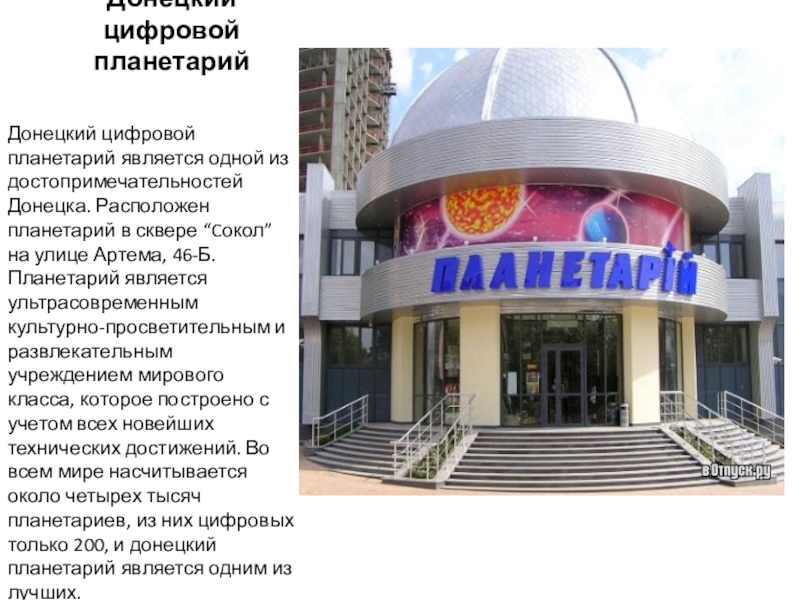 Донецкий цифровой планетарий является одной из достопримечательностей Донецка. Расположен