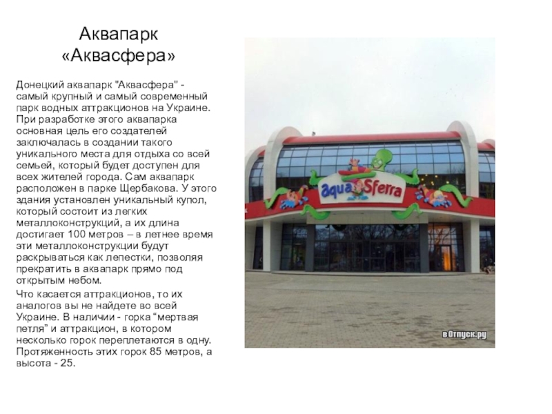 водных аттракционов на Украине. При разработке этого аквапарка основная цель его создателей заключалась в создании такого уникального места для отдыха со всей семьей, который будет доступен для всех жителей города. Сам аквапарк расположен в парке Щербакова. У этого здания установлен уникальный купол, который состоит из легких металлоконструкций, а их длина достигает 100 метров – в летнее время эти металлоконструкции будут раскрываться как лепестки, позволяя прекратить в аквапарк прямо под открытым небом.