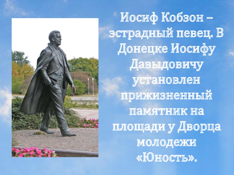 Иосиф Кобзон –эстрадный певец. В Донецке Иосифу Давыдовичу установлен прижизненный памятник на площади у Дворца молодежи «Юность».