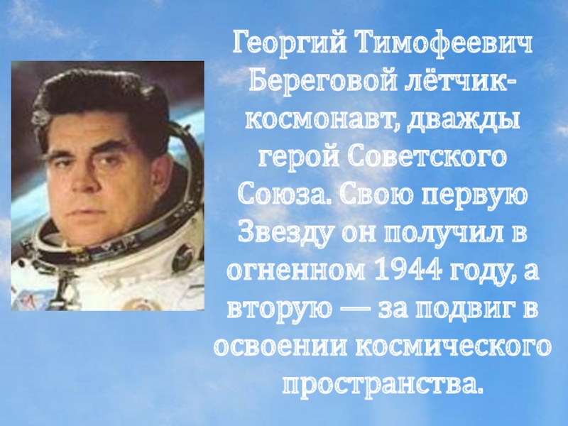 Слайд 10Георгий Тимофеевич Береговой лётчик-космонавт, дважды герой Советского Союза. Свою первую Звезду