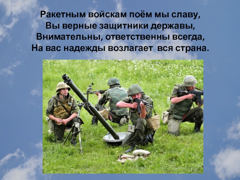 Слайд 5Ракетным войскам поём мы славу, Вы верные защитники державы, Внимательны, ответственны всегда, На вас