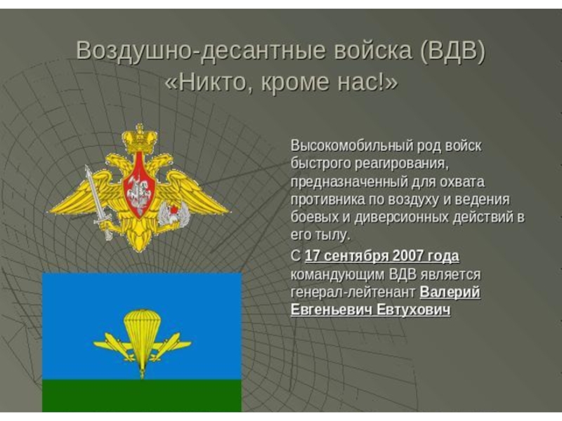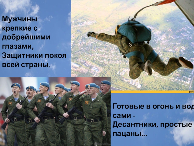 Мужчины крепкие с добрейшими глазами, Защитники покоя всей страны, Готовые в огонь и воду сами - Десантники,