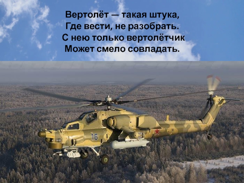 Слайд 10Вертолёт — такая штука, Где вести, не разобрать. С нею только