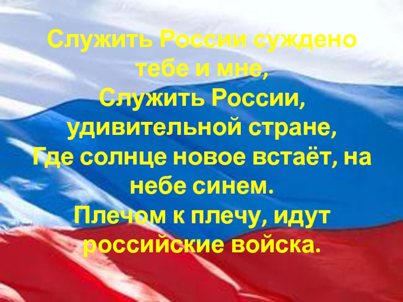 Слайд 19Служить России суждено тебе и мне, Служить России, удивительной стране, Где солнце новое