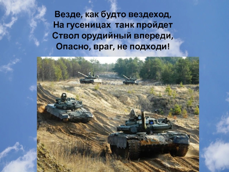 Слайд 7Везде, как будто вездеход, На гусеницах  танк пройдет Ствол орудийный впереди, Опасно, враг, не