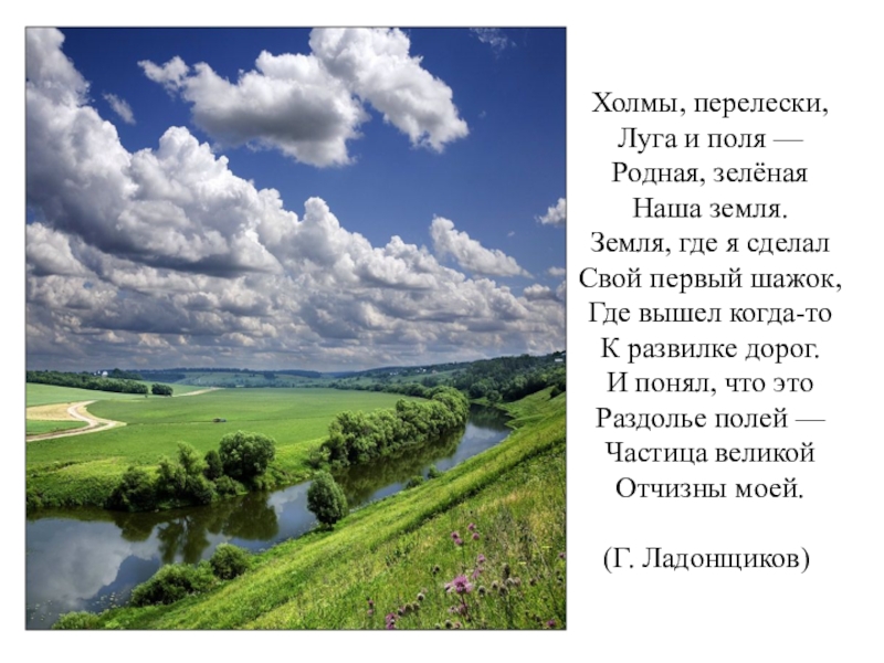 Наша земля. Земля, где я сделал Свой первый шажок, Где вышел когда-то К развилке дорог. И понял, что это Раздолье полей — Частица великой Отчизны моей.   (Г. Ладонщиков)