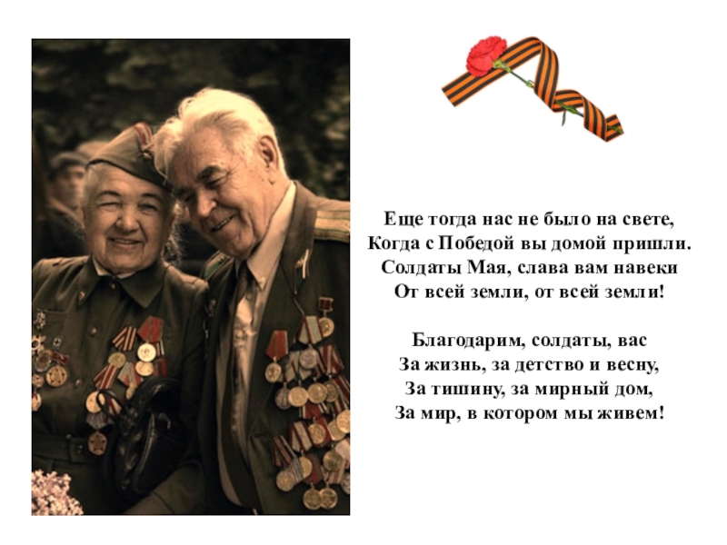 Еще тогда нас не было на свете,  Когда с Победой вы домой пришли.  Солдаты