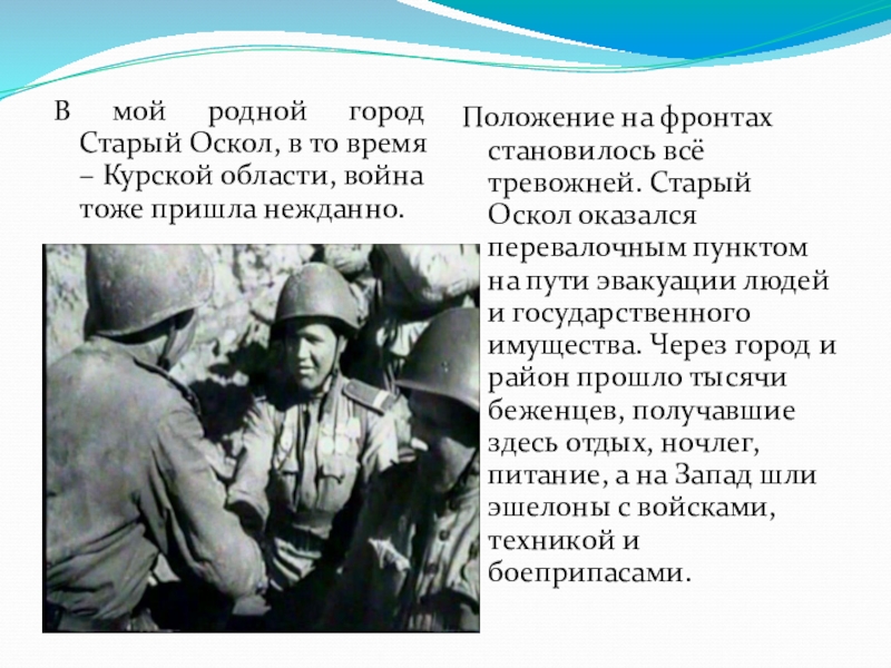 Положение на фронтах становилось всё тревожней. Старый Оскол оказался перевалочным пунктом на пути эвакуации людей и государственного имущества. Через город и район прошло тысячи беженцев, получавшие здесь отдых, ночлег, питание, а на Запад шли эшелоны с войсками, техникой и боеприпасами.