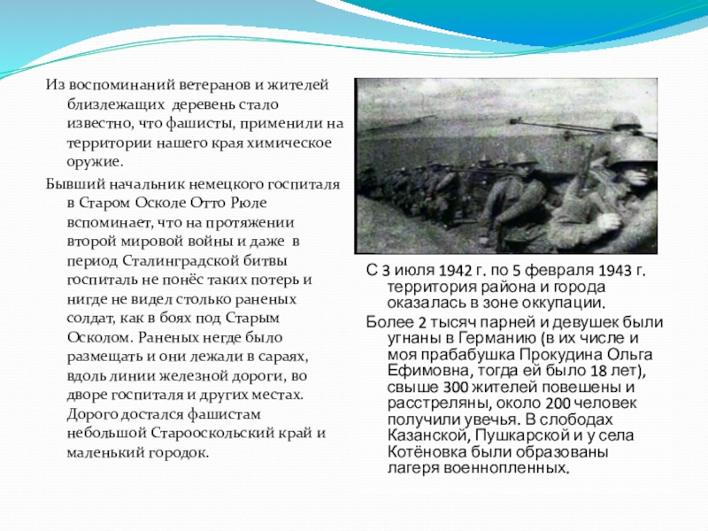 Более 2 тысяч парней и девушек были угнаны в Германию (в их числе и моя прабабушка Прокудина Ольга Ефимовна, тогда ей было 18 лет), свыше 300 жителей повешены и расстреляны, около 200 человек получили увечья. В слободах Казанской, Пушкарской и у села Котёновка были образованы лагеря военнопленных.