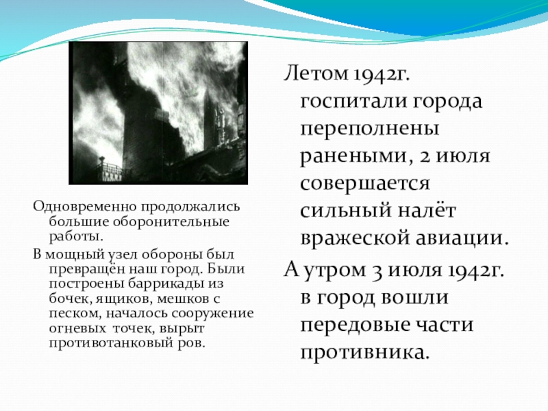Летом 1942г. госпитали города переполнены ранеными, 2 июля совершается сильный налёт вражеской авиации.