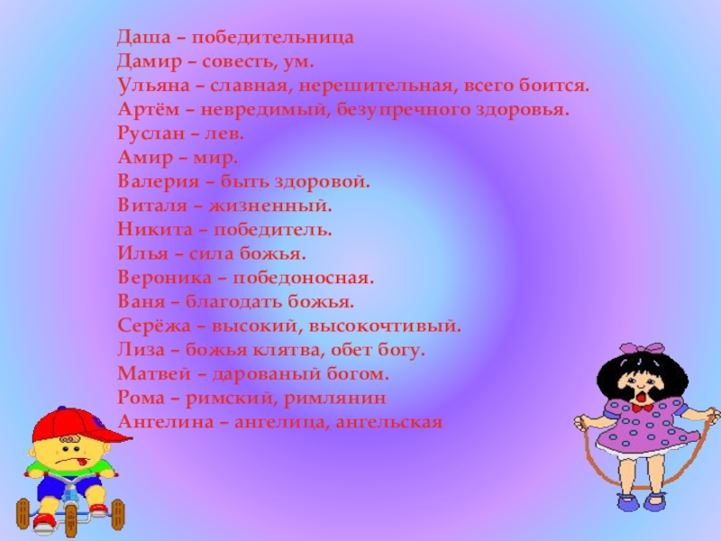Даша – победительницаДамир – совесть, ум.Ульяна – славная, нерешительная, всего боится.Артём – невредимый, безупречного здоровья.Руслан – лев.Амир – мир.Валерия – быть здоровой.Виталя – жизненный.Никита – победитель.Илья – сила божья.Вероника – победоносная.Ваня – благодать божья.Серёжа – высокий,