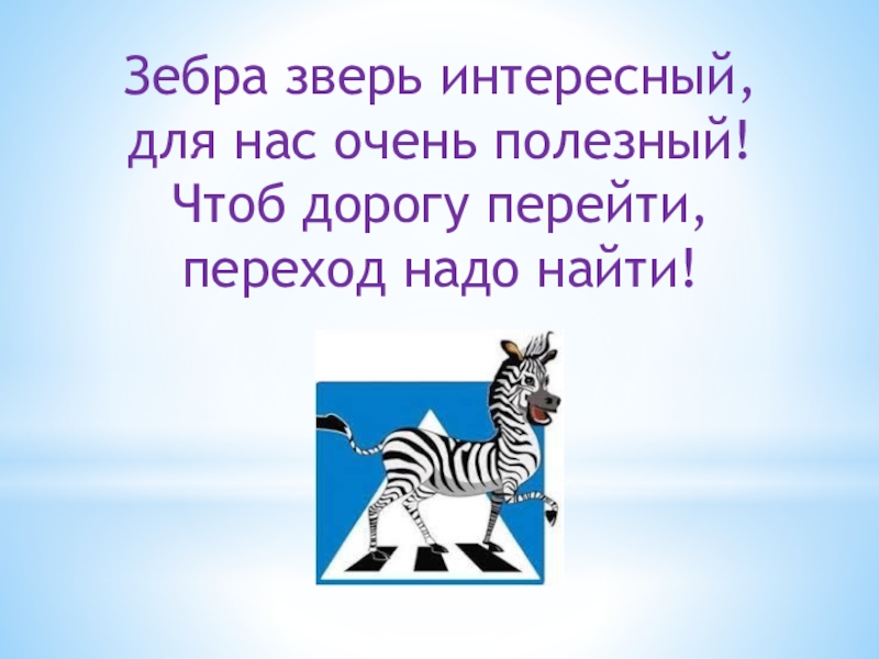 Зебра зверь интересный, для нас очень полезный!Чтоб дорогу перейти,переход надо найти!