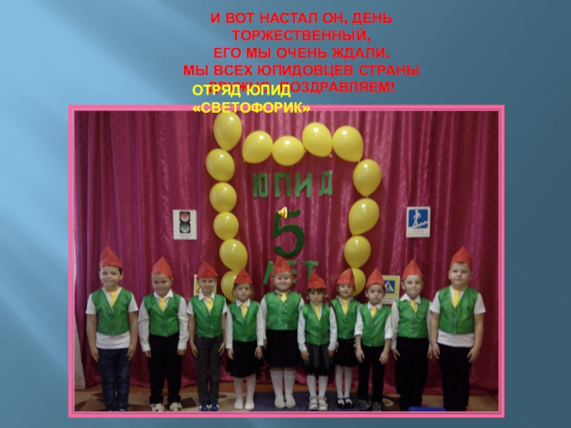 И ВОТ НАСТАЛ ОН, ДЕНЬ ТОРЖЕСТВЕННЫЙ,ЕГО МЫ ОЧЕНЬ ЖДАЛИ.МЫ ВСЕХ ЮПИДОВЦЕВ СТРАНЫ ДРУЖНО ПОЗДРАВЛЯЕМ!ОТРЯД ЮПИД «СВЕТОФОРИК»