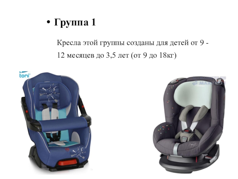Группа 1	Кресла этой группы созданы для детей от 9 - 	12 месяцев до 3,5 лет (от 9