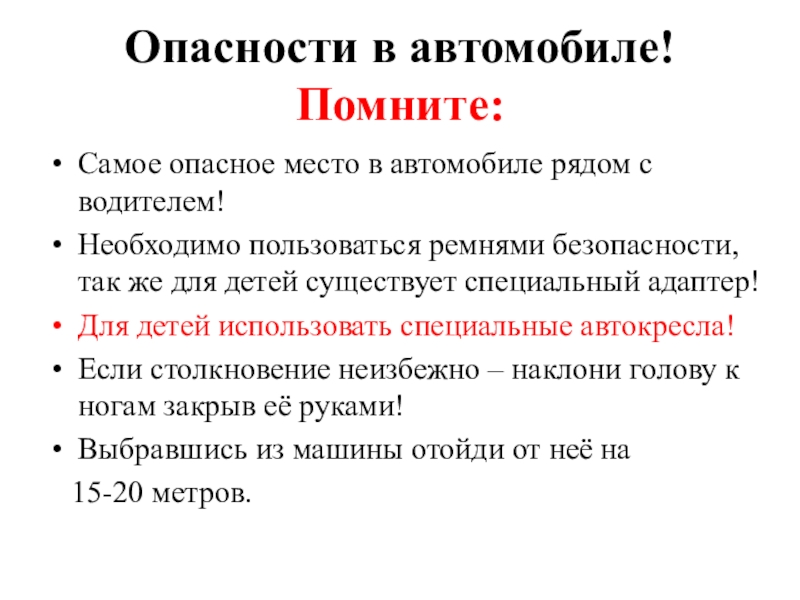 Опасности в автомобиле! Помните:Самое опасное место в автомобиле рядом с водителем!Необходимо пользоваться ремнями безопасности, так же для детей существует специальный адаптер!Для детей использовать специальные автокресла!Если столкновение неизбежно – наклони голову к ногам закрыв её руками!Выбравшись из