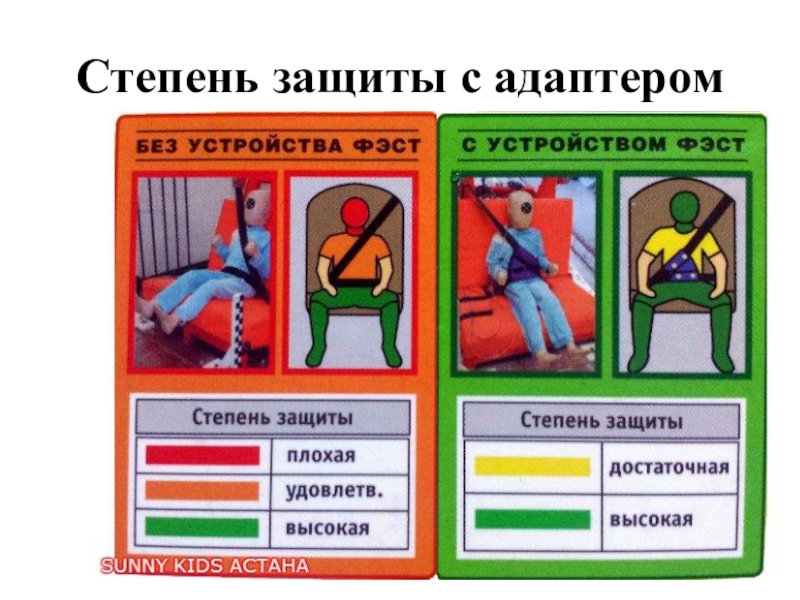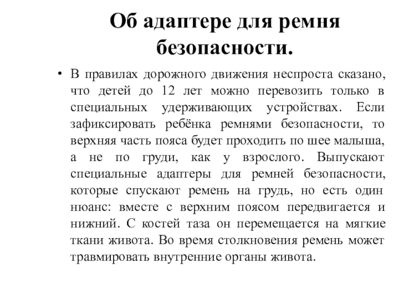 детей до 12 лет можно перевозить только в специальных удерживающих устройствах. Если зафиксировать ребёнка ремнями безопасности, то верхняя часть пояса будет проходить по шее малыша, а не по груди, как у взрослого. Выпускают специальные адаптеры для ремней безопасности, которые спускают ремень на грудь, но есть один нюанс: вместе с верхним поясом передвигается и нижний. С костей таза он перемещается на мягкие ткани живота. Во время столкновения ремень может травмировать внутренние органы живота.